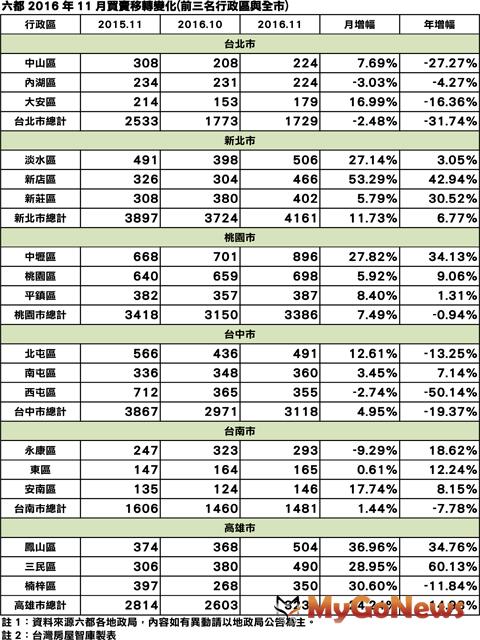 六都地政局公布2016年11月最新建物買賣移轉棟數表現,分別是台北市1729棟,月減2.48%,年減31.74%;新北市4161棟,月增11.73%,年增6.77%;桃園市3386棟,月增7.49%,年減0.94%;台中市3118棟,月增4.95%,年減19.37%;台南市1481棟,月增1.44%,年減7.78%;高雄市3234棟,月增24.24%,年增14.93%。