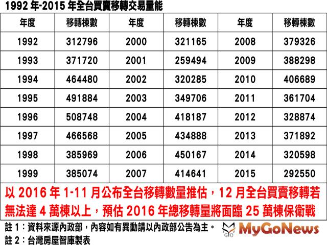 【MyGoNews蕭又安/綜合報導】根據內政部統計至2016年至10月底,全台移轉數量為197,201棟,以11月公布六都數量推估,12月全台買賣移轉若無法達4萬棟以上,全年將落入1992年內政部統計移轉棟數以來新低,且2016年底已經沒有2015年趕輕稅交屋潮,預估2016年總移轉量將面臨25萬棟保衛戰。